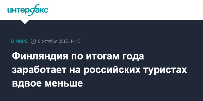 Москва. 8 октября. INTERFAX.RU - Российские туристы по итогам 2015 года потратят вдвое меньше в Финляндии, чем годом ранее, сообщает финская телерадиокомпания Yle.