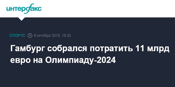 Москва. 8 октября. INTERFAX.RU - Проект бюджета на проведение летних Олимпийских игр 2024 года в Гамбурге, представленный бургомистром Олафом Шольцем в четверг, предусматривает затраты в размере 11,2 млрд евро, сообщает агентство DPA.