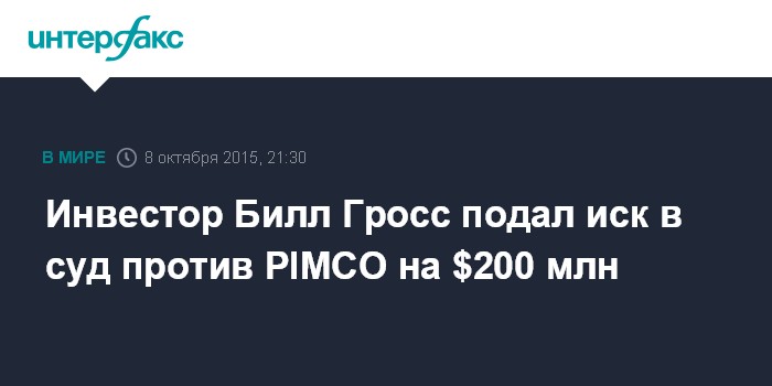 Москва. 8 октября. INTERFAX.RU - Инвестор Билл Гросс подал в суд на основанную им управляющую компанию Pacific Investment Management Co. (PIMCO), уволившую его в прошлом году, сообщает агентство Bloomberg.