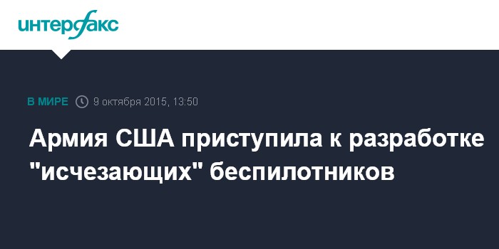 Москва. 9 октября. INTERFAX.RU - Агентство перспективных оборонных разработок (DARPA) Пентагона намерено разработать "исчезающие" беспилотные летательные аппараты, которые будут использоваться силами специальных операций, сообщает N+1 со ссылкой на Defense Systems. Такие аппараты будут доставлять бойцам спецподразделений важное оборудование, а затем исчезать без следа. Причем, согласно требованиям DARPA, в понятие "исчезать" не входит камуфлирование аппарата, переноска или его отправка в исходную точку.