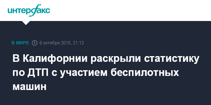 Москва. 9 октября. INTERFAX.RU - Департамент транспортных средств штата Калифорния опубликовал открытую статистику по ДТП, в которых участвовали беспилотные автомобили, сообщает сайт N+1. Опубликованные данные охватывают промежуток с октября 2014 года по октябрь 2015 года и содержат в себе информацию о девяти инцидентах с участием автомобилей, оборудованных системами автономного передвижения.
