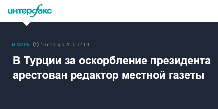 Москва. 10 октября. INTERFAX.RU - В Турции полиция арестовала редактора англоязычной газеты по подозрению в оскорблении президента Реджепа Эрдогана, передает Би-би-си.