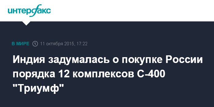 Москва. 11 октября. INTERFAX.RU - В Индии обдумывают вопрос о покупке у России около 12 зенитных ракетных комплексов С-400 "Триумф", сообщает в воскресенье газета The Times of India.