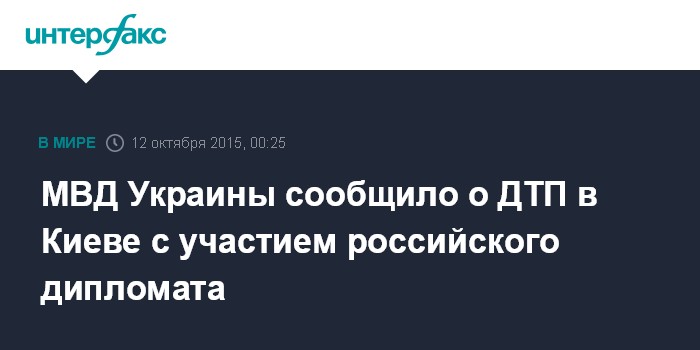 Москва. 12 октября. INTERFAX.RU - Российский дипломат попал ДТП под Киевом и заперся в автомобиле от полиции, которая в ходе общения констатировала у него признаки алкогольного опьянения, сообщил директор департамента коммуникации МВД Украины Артем Шевченко.
