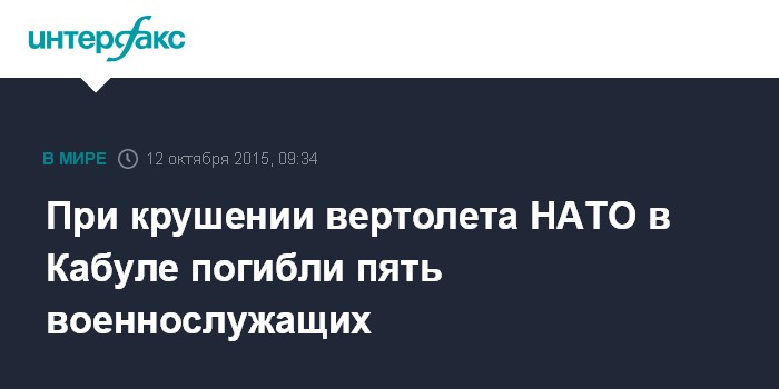 Москва. 12 октября. INTERFAX.RU - Пятеро натовских военнослужащих, находившихся в Афганистане в рамках миссии НАТО "Решительная поддержка", погибли в результате крушения вертолета в Кабуле, сообщили в понедельник представители афганских властей.