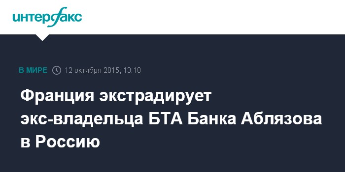 Москва. 12 октября. INTERFAX.RU - Правительство Франции в понедельник вынесло решение об экстрадиции экс-владельца БТА Банка Мухтара Аблязова в Россию, сообщил Роман Марченко, старший партнер юрфирмы "Ильяшев и Партнеры", которая в течение шести лет представляет интересы потерпевших - БТА Банков (Казахстан и Украина).