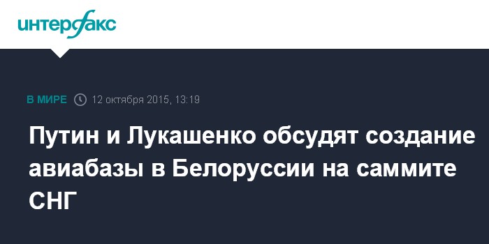 Москва. 12 октября. INTERFAX.RU - Президент РФ Владимир Путин и вновь избранный президент Белоруссии Александр Лукашенко в конструктивном ключе обсуждают вопрос о создании в этой стране российской авиабазы, сообщил журналистам в понедельник пресс-секретарь главы государства Дмитрий Песков.