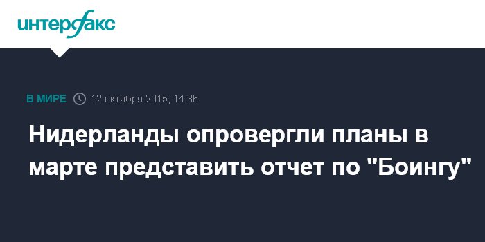 Москва. 12 октября. INTERFAX.RU - В Генпрокуратуре Нидерландов опровергли информацию о том, что результаты уголовного расследования по выявлению ответственных за крушение малайзийского "Боинга" на востоке Украины будут обнародованы в феврале 2016 года.