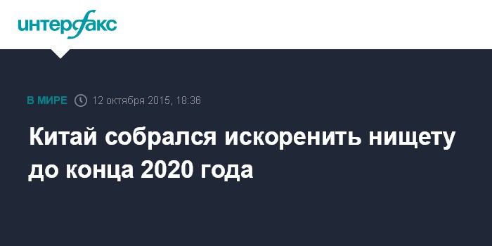 Москва. 12 октября. INTERFAX.RU - Власти Китая заявили о планах полностью искоренить нищету до конца 2020 года, говорится в сообщении Государственного совета КНР. Таким образом, Китай попытается на 10 лет опередить остальной мир: в целях устойчивого развития ООН фигурирует 2030 год.