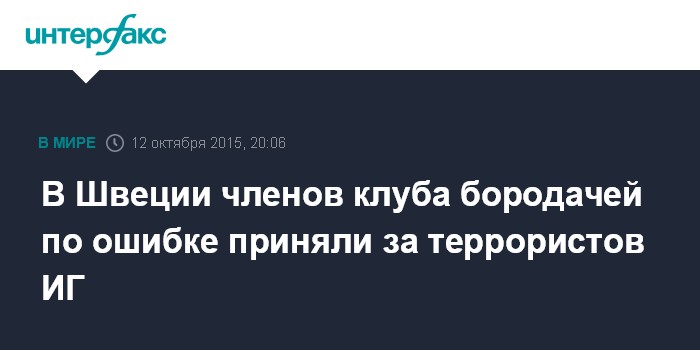 Москва. 12 октября. INTERFAX.RU - В шведском городе Йончепинг прохожий вызвал полицию, приняв членов клуба бородачей за экстремистов из террористической группировки "Исламское государство" (запрещена в России - ИФ), сообщили в понедельник западные СМИ.