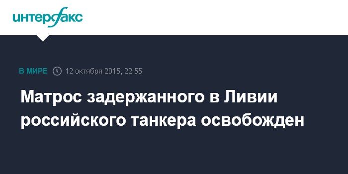 Москва. 12 октября. INTERFAX.RU - Освобожден и доставлен в Россию второй член экипажа российского нефтеналивного танкера "Механик Чеботарёв", который был задержан в Ливии 16 сентября, сообщил глава Чеченской республики Рамзан Кадыров.