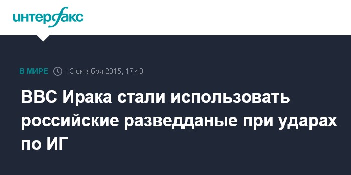 Москва. 13 октября. INTERFAX.RU - Иракские ВВС при нанесении авиаударов по позициям запрещенного в РФ "Исламского государства" уже стали учитывать разведданные, передаваемые, в частности, Россией, заявил во вторник глава комитета по вопросам обороны иракского парламента Хаким аз-Замили.