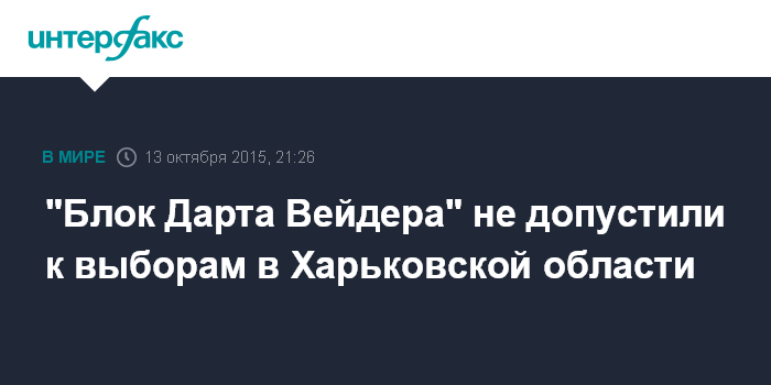 Москва. 13 октября. INTERFAX.RU - Харьковская областная избирательная комиссия на Украине не зарегистрировала "Блок Дарта Вейдера" для участия в выборах в облсовет, несмотря на решение суда.