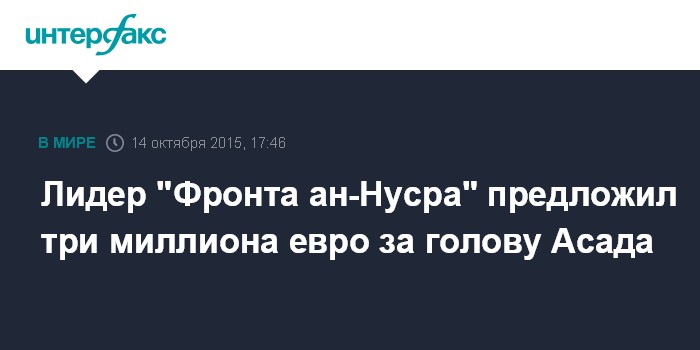 Москва. 14 октября. INTERFAX.RU - Лидер отделения "Аль-Каиды" в Сирии "Фронта ан-Нусра" Абу Мухаммад аль-Джулани предложил три миллиона евро (около 213,5 миллиона рублей) за убийство президента страны Башара Асада, сообщила в среду французская газета Le Figaro.