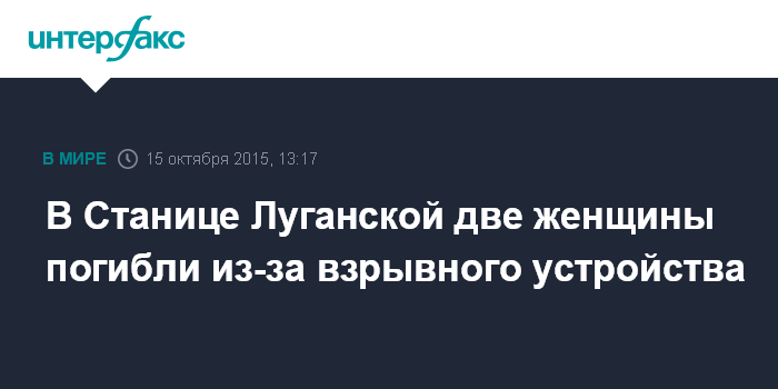 Москва. 15 октября. INTERFAX.RU - В поселке городского типа Станица Луганская на неизвестном взрывном устройстве подорвались и погибли две женщины, сообщает милиция Луганской области Украина.