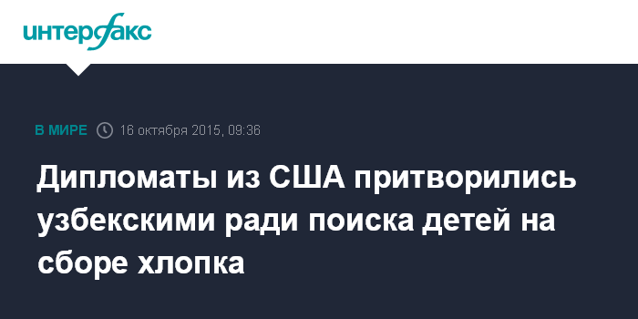 Москва. 16 октября. INTERFAX.RU - Сотрудники посольства США в Ташкенте, выдавая себя за представителей МИД Узбекистана и журналистов, искали на полях юго-западной Кашкадарьинской области детей, которых принуждают собирать хлопок, сообщили в пятницу местные СМИ.