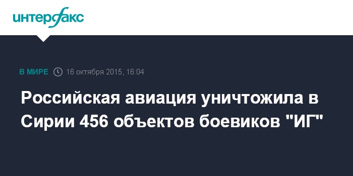 Москва. 16 октября. INTERFAX.RU - Самолеты российской авиагруппы совершили в Сирии почти 670 вылетов, в результате которых было уничтожено более 450 объектов террористов, сообщил начальник Главного оперативного управления Минобороны РФ Андрей Картаполов.