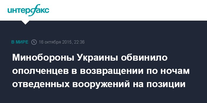 Москва. 16 октября. INTERFAX.RU - Служба связей с общественностью Главного управления разведки Министерства обороны Украины обвинило ополченцев Донбасса в том, что те по ночам возвращают на позиции вооружения, отведенные в присутствии представителей СММ ОБСЕ на Мариупольском направлении.