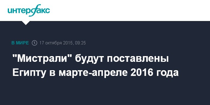 Москва. 17 октября. INTERFAX.RU - Париж намерен поставить два вертолетоносца "Мистраль" Каиру в апреле-марте 2016 года, корабли достигнут Египта к началу лета, сообщил "Интерфаксу" представитель французской кораблестроительной компании DCNS.
