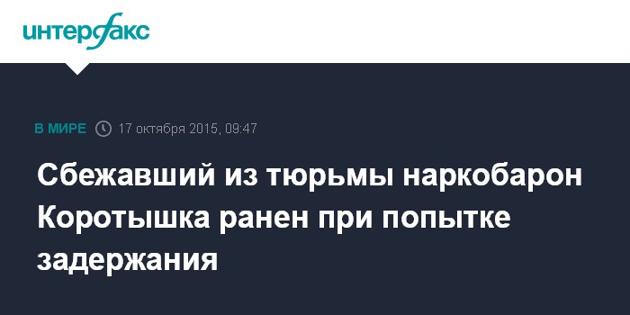 Москва. 17 октября. INTERFAX.RU - Бежавший из тюрьмы мексиканский наркобарон Хоакин Гусман по прозвищу Эль Чапо (Коротышка) получил ранения в лицо и в ногу в ходе операции по его поимке, передает в субботу агентство EFE со ссылкой на власти Мексики.