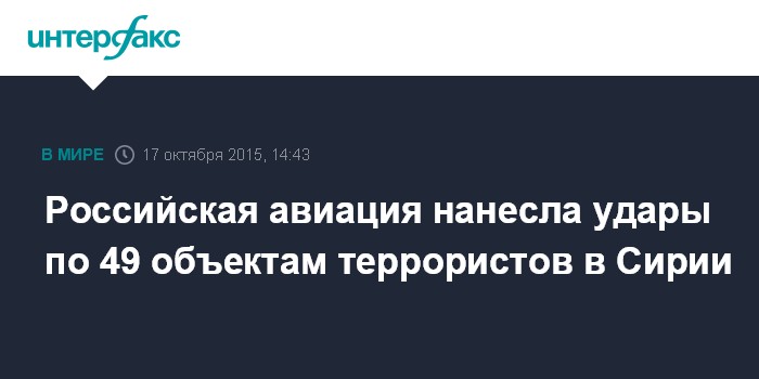 Москва. 17 октября. INTERFAX.RU - Авиагруппы ВКС РФ выполнили 39 боевых вылетов по 49 объектам инфраструктуры террористов в Сирии, сообщил в субботу журналистам официальный представитель Минобороны России генерал-майор Игорь Конашенков.