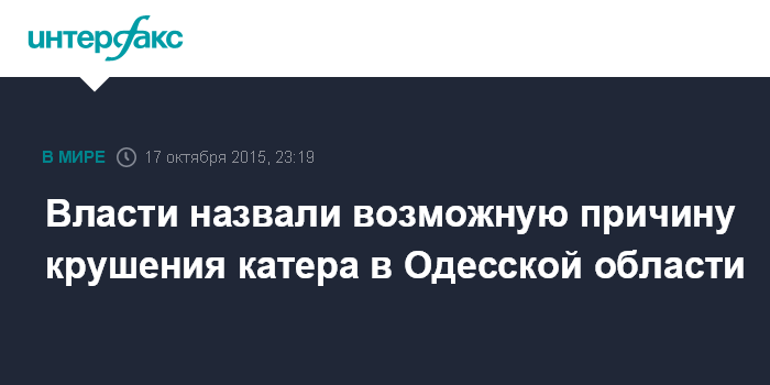 Москва. 17 октября. INTERFAX.RU - По предварительным данным, причиной крушения прогулочного катера в Одесской области, в результате которого погибли 12 человек, стала перегрузка судна, сообщил заместитель министра инфраструктуры Украины Юрий Васьков.