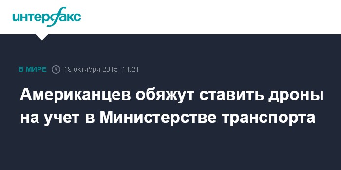 Москва. 19 октября. INTERFAX.RU - Американские власти намерены обязать всех владельцев беспилотников регистрировать летательные аппараты, сообщает NBC News со ссылкой на свои источники. Официальное заявление будет сделано 19 октября.
