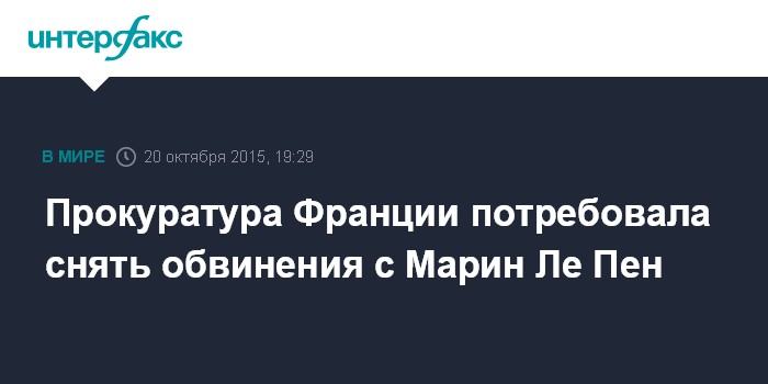 Москва. 20 октября. INTERFAX.RU - Прокуратура Франции во вторник заявила о необходимости снять обвинения с лидера крайне правой партии "Национальный фронт" Марин Ле Пен, которую ранее обвинили в разжигании ненависти, сообщает "Би-би-си".