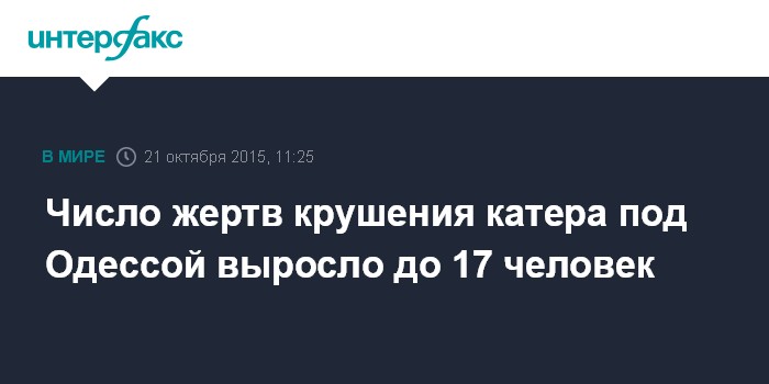 Москва. 21 октября. INTERFAX.RU - Число жертв крушения катера "Иволга" в поселке Затока Одесской области выросло до 17 человек. Об этом сообщает местная милиция.