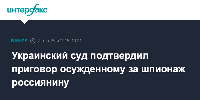 Москва. 21 октября. INTERFAX.RU - Апелляционный суд Черниговской области оставил без изменений приговор Деснянского районного суда Чернигова, назначившего гражданину Российской Федерации девять лет лишения свободы за шпионаж.