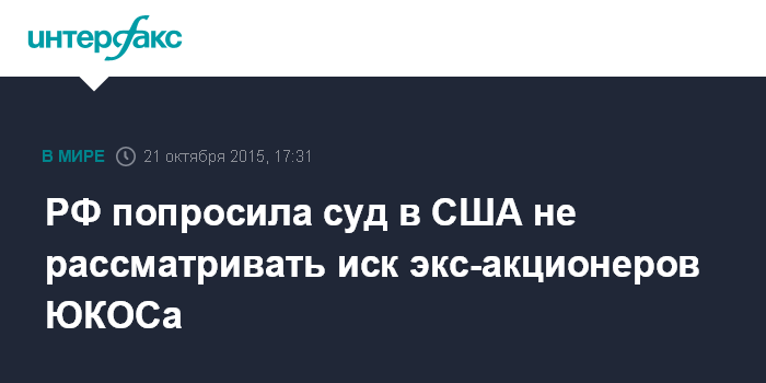 Газета "Коммерсант" ранее сообщала, что согласно решению суда округа Колумбия Россия до 21 октября может направить свою позицию по жалобе экс-акционеров ЮКОСа.