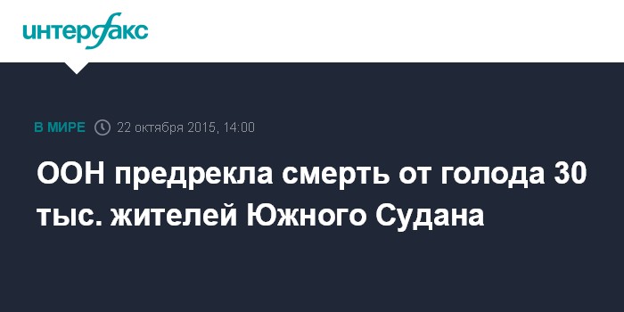 Москва. 22 октября. INTERFAX.RU - Катастрофическая нехватка продовольствия может привести к гибели не менее 30 тыс. человек в Южном Судане, заявили в четверг три профильных агентства ООН.