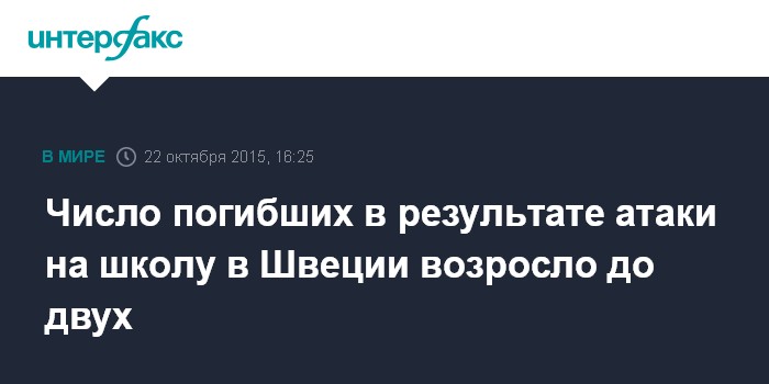 Москва. 22 октября. INTERFAX.RU - Число жертв нападения на одну из школ в городе Тролльхеттан на западе Швеции увеличилось до двух, сообщают в твиттере шведские журналисты.