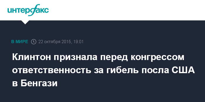 Москва. 22 октября. INTERFAX.RU - Экс-госсекретарь США Хиллари Клинтон заявила в четверг на слушаниях перед комитетом конгресса США, расследующим гибель посла США Кристофера Стивенса в ливийском городе Бенгази в 2012 году, что она несет ответственность за этот инцидент.