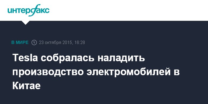 Москва. 23 октября. INTERFAX.RU - Американская автомобилестроительная компания Tesla Motors Inc. планирует начать производство электромобилей в Китае в течение двух лет, рассчитывая на государственные программы поддержки экологичного автотранспорта, пишет MarketWatch.