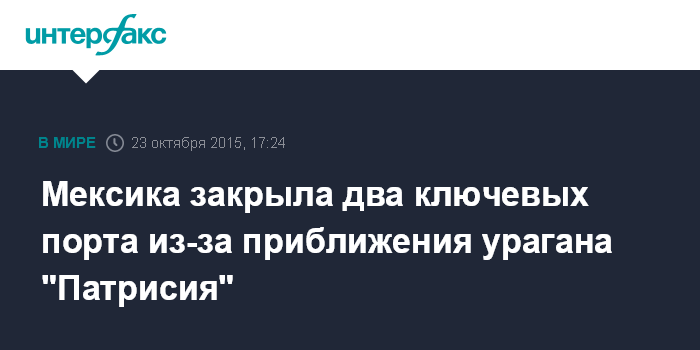 Москва. 23 октября. INTERFAX.RU - Власти Мексики приняли решение закрыть главные порты страны - Пуэрто-Вальярта и Мансанильо - из-за приближения урагана "Патрисия", который признан самым мощным в истории наблюдений. Об этом сообщают в пятницу западные СМИ.