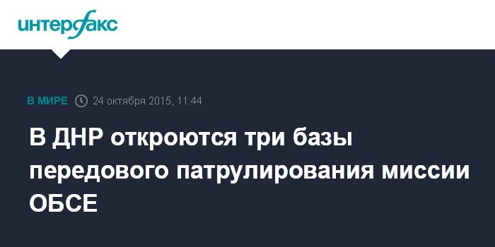 Москва. 24 октября. INTERFAX.RU - В Горловке, Дебальцево и Енакиево 25 октября откроются базы передового патрулирования специальной мониторинговой миссии (СММ) ОБСЕ для удобства наблюдения за происходящим на линии соприкосновения, сообщает Донецкое агентство новостей со ссылкой на источник, знакомый с ситуацией.