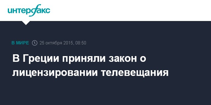 Москва. 25 октября. INTERFAX.RU - Закон о лицензировании телевещания принял в субботу парламент Греции, сообщили местные СМИ.