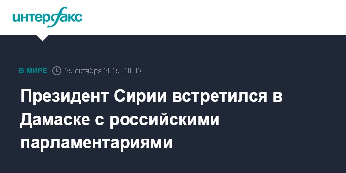 Москва. 25 октября. INTERFAX.RU - Российские парламентарии в воскресенье встретились с президентом Сирии Башаром Асадом в Дамаске, сообщил "Интерфаксу" член делегации, депутат Госдумы от КПРФ Александр Ющенко