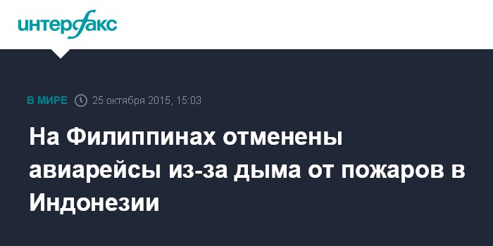 Москва. 25 октября. INTERFAX.RU - Власти Филиппин вынуждены были в воскресенье отменить ряд авиарейсов и привести в состояние повышенной готовности к приему пострадавших медицинские учреждения в связи с дымом, который ветром несет из Индонезии, где бушуют лесные пожары, сообщают местные СМИ.