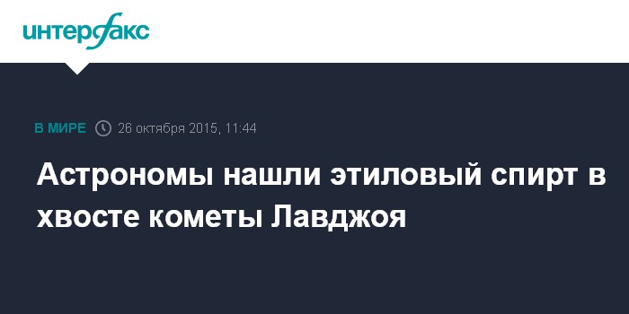 Москва. 26 октября. INTERFAX.RU - Международная группа астрономов во главе со специалистами из Парижской обсерватории обнаружила в газовом хвосте кометы C/2014 Q2 (Лавджоя) присутствие 21 сложной органической молекулы, включая этиловый спирт и наиболее простейшую форму сахара - гликольальдегид. Это первое в истории открытие алкоголя в веществе кометы, пишет N+1 со ссылкой на Science Advances.
