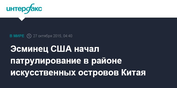 Москва. 27 октября. INTERFAX.RU - Военный патруль ВМС США направлен вести вахту рядом с искусственными островами, созданными Китаем в Южно-Китайском море, сообщает Reuters со ссылкой на источник в Пентагоне. Миссию будет осуществлять эсминец USS Lassen в радиусе двенадцатимильной морской зоны.
