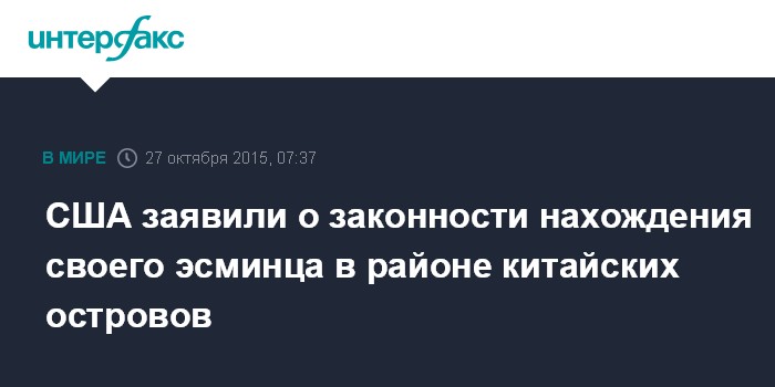 Москва. 27 октября. INTERFAX.RU - Проход американского эсминца вблизи китайских искусственных островов в Южно-Китайском море, которые, как неоднократно заявляли в Пекине, расположены в 12-мильной зоне Китая, соответствует международным законам, заявил представитель Пентагона.