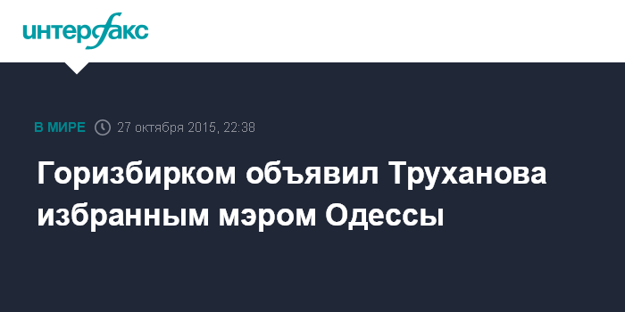 Москва. 27 октября. INTERFAX.RU - Одесская городская избирательная комиссия объявила действующего мэра Одессы Геннадия Труханова победителем выборов на пост городского головы, несмотря на то, что ранее глава Одесской обладминистрации Михаил Саакашвили предложил ему идти на второй тур.