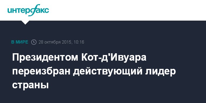 Москва. 28 октября. INTERFAX.RU - Президент Кот-д'Ивуара Алассан Уаттара переизбран по итогам выборов, прошедших в минувшее воскресенье, сообщает в среду американский телеканал Fox News.