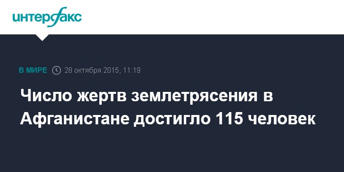 Москва. 28 октября. INTERFAX.RU - В результате землетрясения, произошедшего 26 октября, в Афганистане погибло 115 человек, сообщает в среду пресс-служба президента республики.