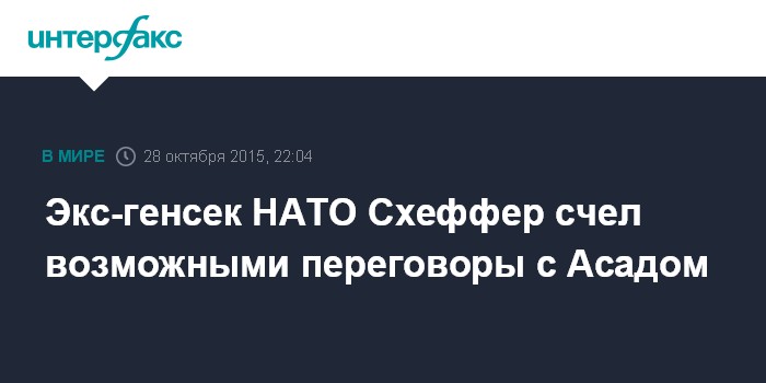 Москва. 28 октября. INTERFAX.RU - Генеральный секретарь НАТО в 2004-2009 годах голландец Яап де Хооп Схеффер в интервью фламандскому журналу Knack, перепечатанном бельгийским франкоязычным еженедельником Le Vif L'Express 28 октября, заявил о возможности диалога с Башаром Асадом ради сирийского урегулирования.