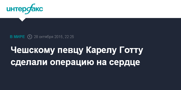 Москва. 28 октября. INTERFAX.RU - Чешский эстрадный певец Карел Готт, которому во вторник сделали операцию на сердце, находится в стабильном состоянии, послеоперационный период проходит без осложнений, сообщила в среду в "Фейсбуке" жена музыканта Ивана.