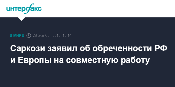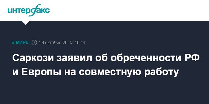 Москва. 29 октября. INTERFAX.RU - Россия и Европа должны сотрудничать друг с другом и преодолеть существующие разногласия, считает бывший президент Франции Николя Саркози.