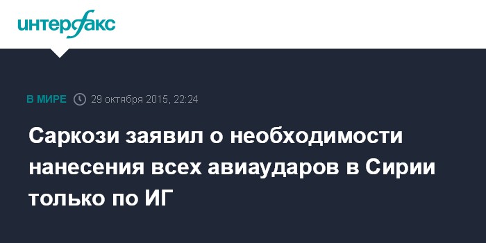 Москва. 29 октября. INTERFAX.RU - Бывший президент Франции Николя Саркози завил в четверг, что в ходе переговоров в России высказался за то, чтобы все страны, наносящие авиаудары в Сирии, сконцентрировались на борьбе против ИГ.